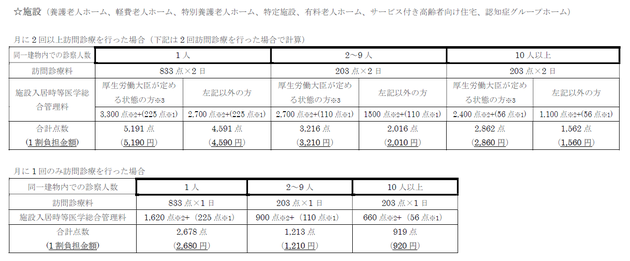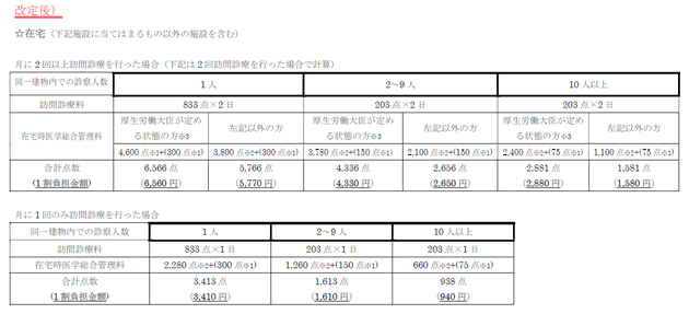現行は自宅の方と施設入所の方とで点数が異なっていますが、改定後はそこに病気の状態や訪問回数、居住状況によっても点数が異なるように変わります。